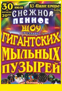 Дорогие друзья! Непременно спешите видеть!!! Снежно-пенное шоу в стране гигантских мыльных пузырей! Это грандиозный шоу-спектакль для детей, аналогов которому в России пока не существует.
