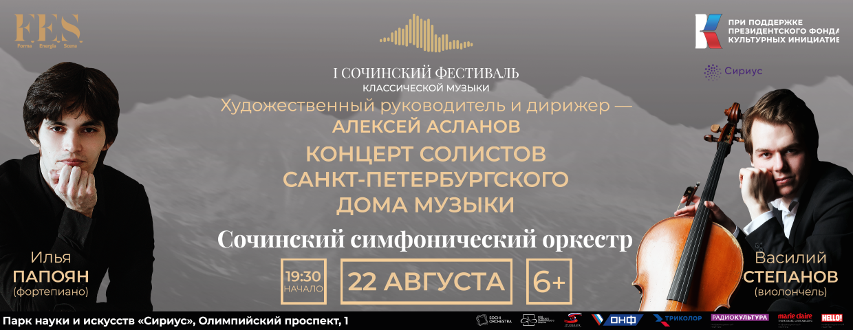 В рамках I Сочинского фестиваля классической музыки на сцене Парка науки и искусства «Сириус» состоится концерт солистов Санкт-Петербургского Дома музыки Василия Степанова и Ильи Папояна. Концерт пройдет в сопровождении Сочинского симфонического оркестра. Дирижер – Алексей Асланов.