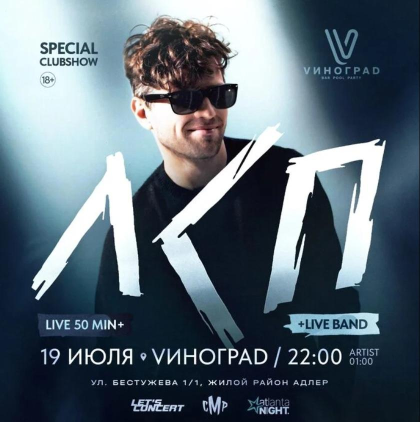 Встречаемся 19 июля в VИНОГРАD, чтобы пропеть главные хиты и не только - на ночном клубном шоу ЛСП + LIVE BAND, ЖИВОЙ ЗВУК.
