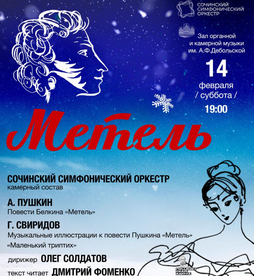 Музыкально-литературная композиция «Метель» в исполнении Сочинского симфонического оркестра объединит гениальную инструментальную музыку композитора Георгия Свиридова и художественное чтение поэтичной повести Александра Сергеевича Пушкина.