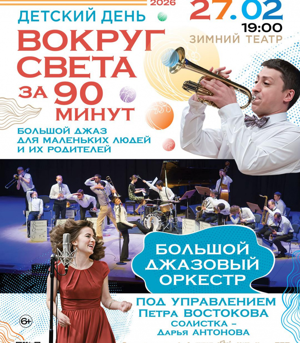 Приглашаем вас на уникальный концерт-путешествие. Вместе с Большим джазовым оркестром Петра Востокова мы совершим невозможное: облетим весь мир, не выходя из зала!