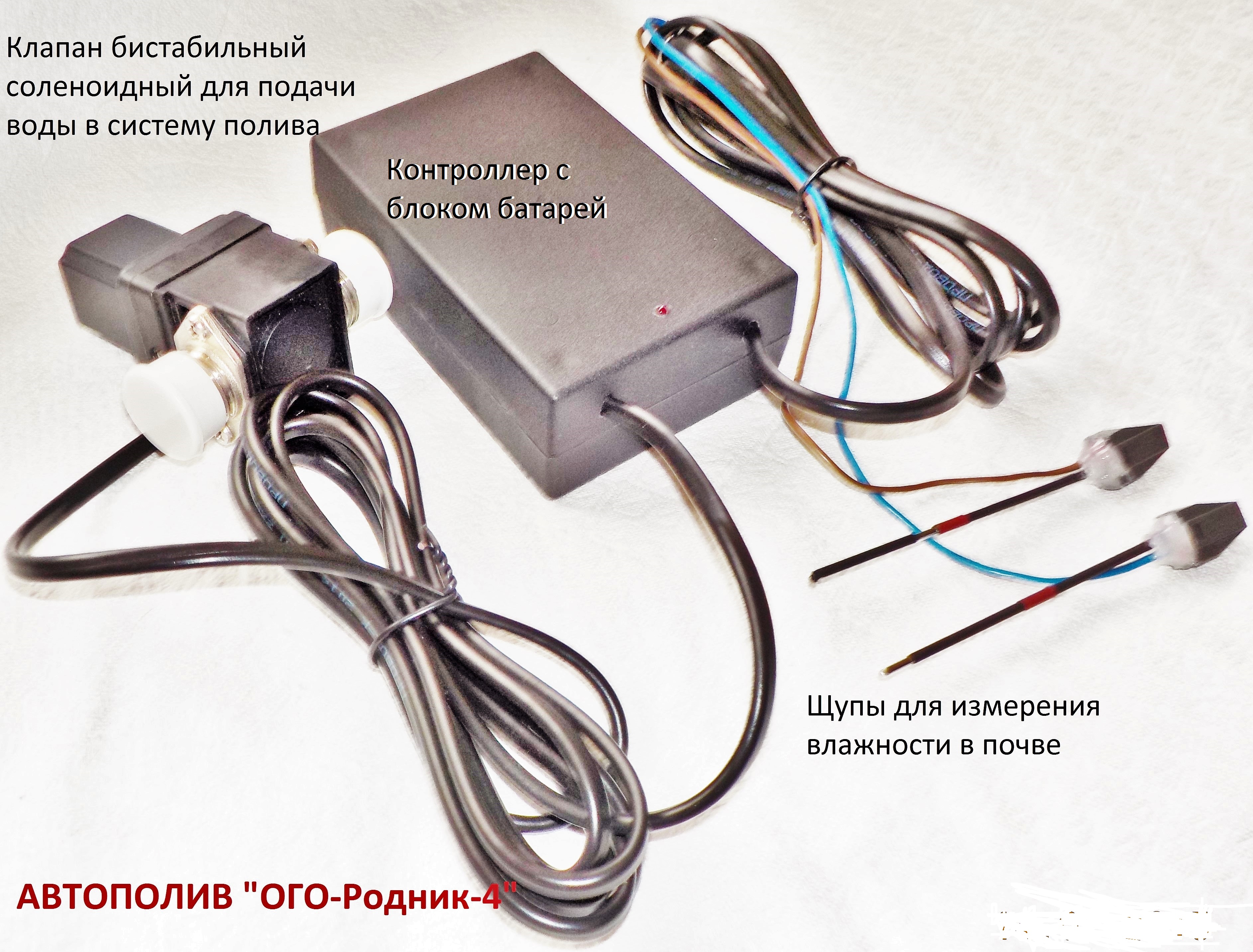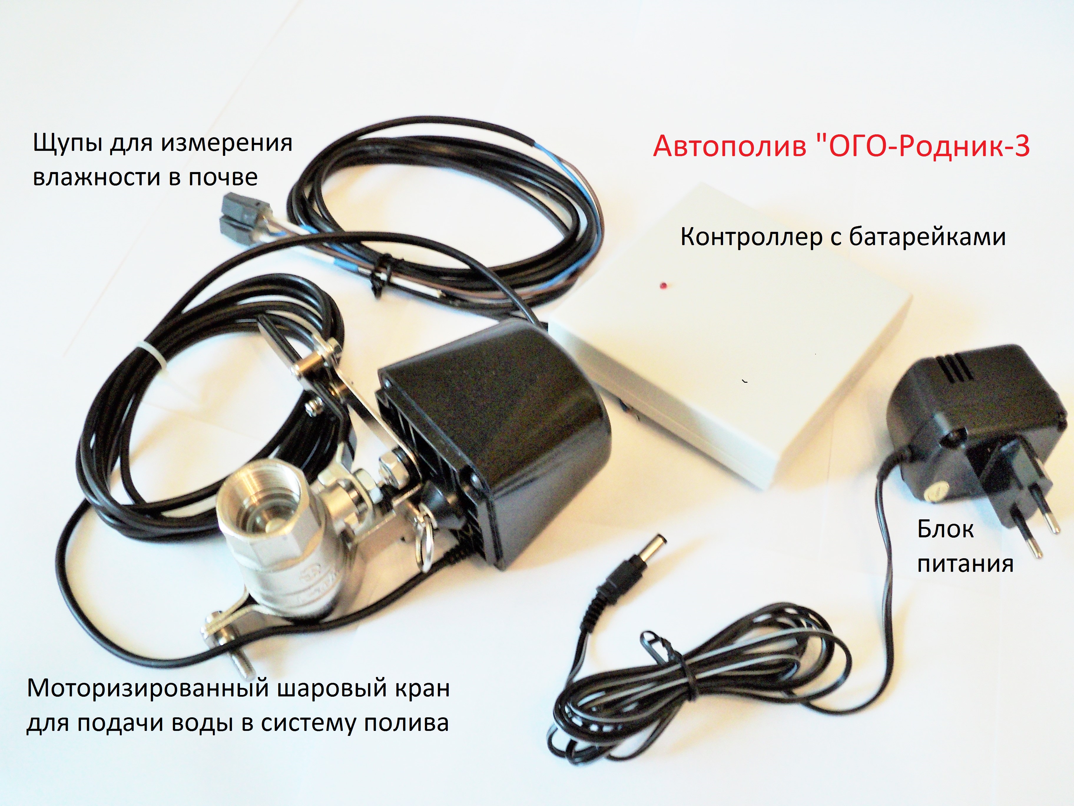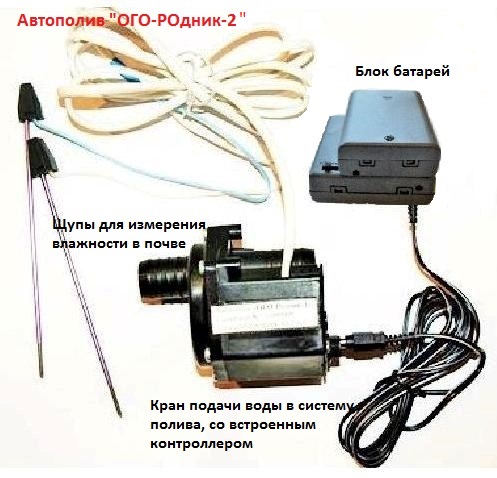Автополив «ОГО-Родник» состоит из блока контроллера, с измерительными щупами и электроклапана или крана с электроприводом. Контроллер посредством щупов измеряет влажность почвы и управляет электроклапаном и индикатором. Индикатор информирует о работе устройства. Электроклапан открывает или закрывает воду для полива.