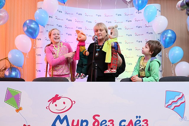 По традиции программы Банк организовал в больнице детский праздник с участием персонажей телепередачи «Спокойной ночи, малыши!» и композитора Владимира Щукина – давних друзей программы «Мир без слез». Перед детьми выступили Хрюша, Степашка и Каркуша, а в конце праздника каждый ребенок получил подарок от своих любимых героев.