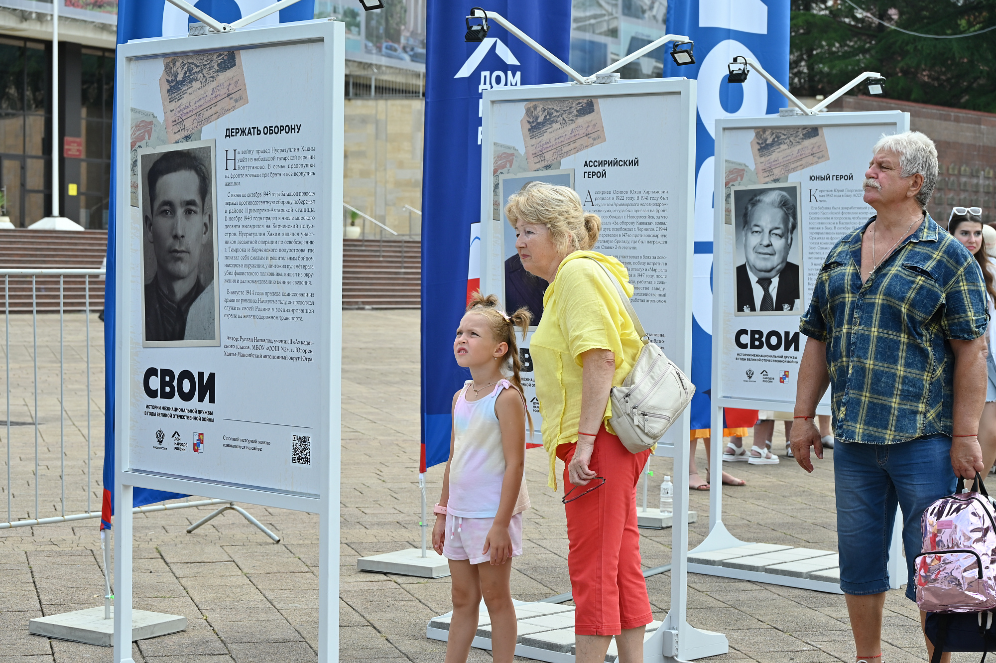 Выставка, рассказывающая о подвигах и межнациональной дружбе в годы Великой Отечественной войны и в период проведения СВО, расположилась в центре Сочи на Площади Флага. В открытии приняли участие руководитель Федерального агентства по делам национальностей Игорь Баринов, руководитель Дома народов России Анна Полежаева, представители национальных объединений Сочи, депутатского корпуса, администрации города, общественных и патриотических организаций курорта, участники и ветераны СВО.