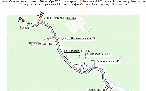 На время проведения мероприятия 20 сентября в период с 9.00 до 18.20 будет ограничено движение транспортных средств на пятикилометровом отрезке автомобильной дороги из поселка Марьино от кафе «У горца» в сторону Лазаревского. Водителей просят учесть изменения при планировании поездок.