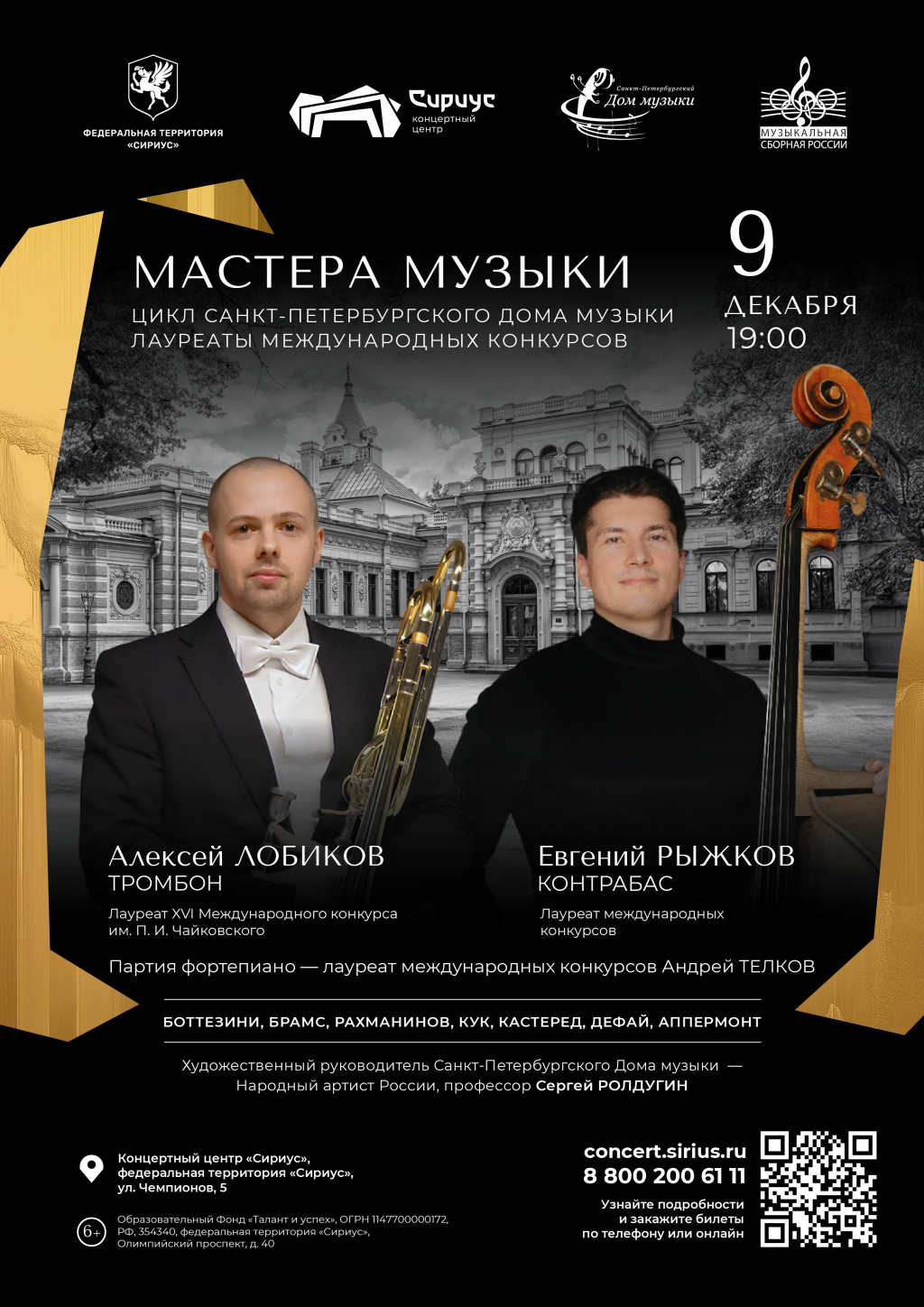 Декабрьские концерты солистов Санкт-Петербургского Дома музыки пройдут в «Сириусе». На сцене выступят лауреаты международных конкурсов, тромбонист Алексей Лобиков и контрабасист Евгений Рыжков