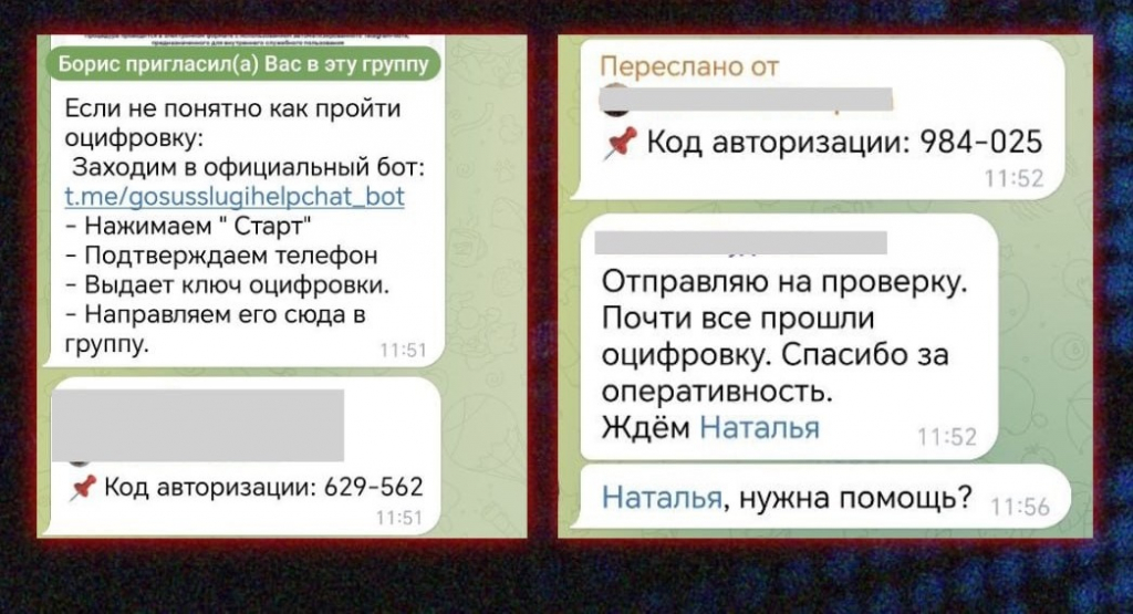 В такой чат добавляют одного реального пользователя и несколько ботов, управляемых мошенниками. Боты, подписанные именами коллег, используют реальные фотографии и имитируют рабочее общение. Под видом руководителя в чате ставится «служебная задача», например, срочно передать код подтверждения для «оцифровки архива». Боты под видом коллеги подтверждают действия друг друга.