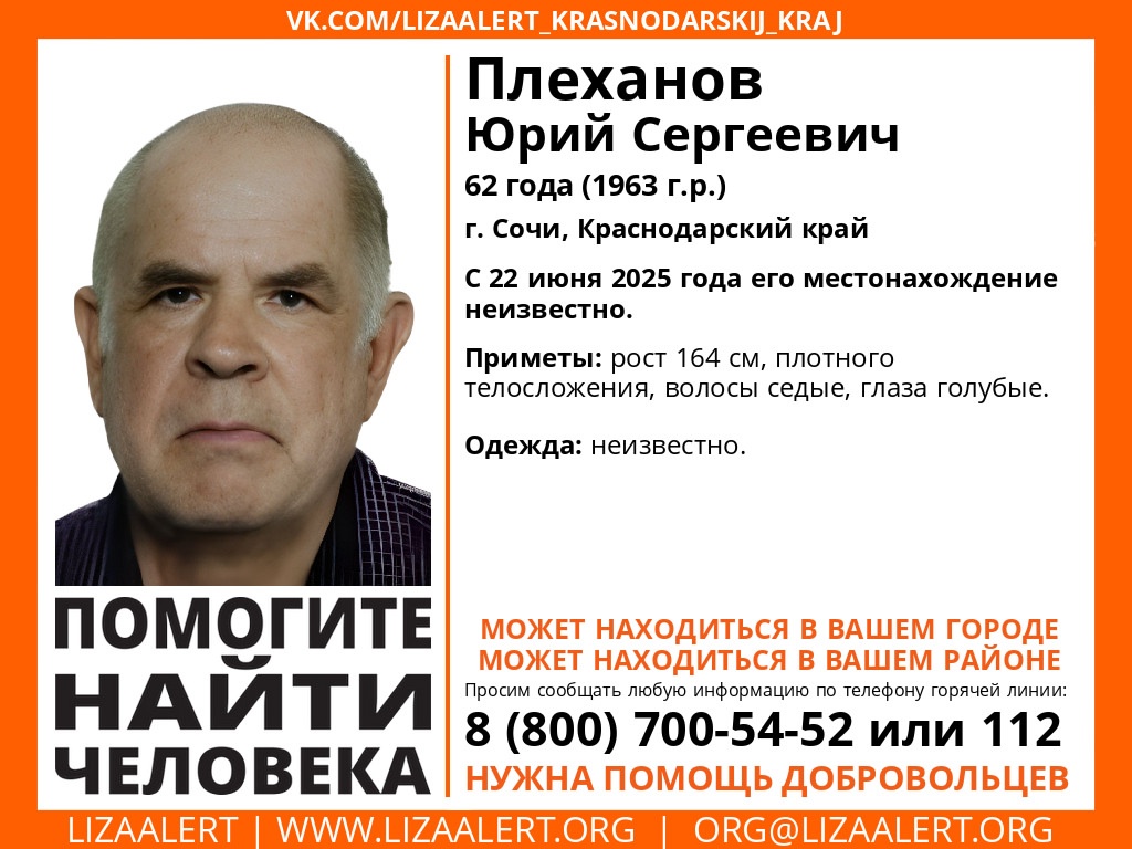 Плеханов Юрий Сергеевич 1963 г.р. пропал в Сочи 22 июня, и с тех пор его местонахождение неизвестно.