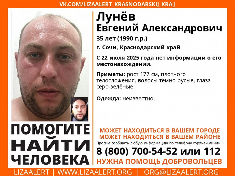 Лунев Евгений Александрович 1990 г.р. пропал в Сочи 22 июля, и с тех пор его местонахождение неизвестно.
