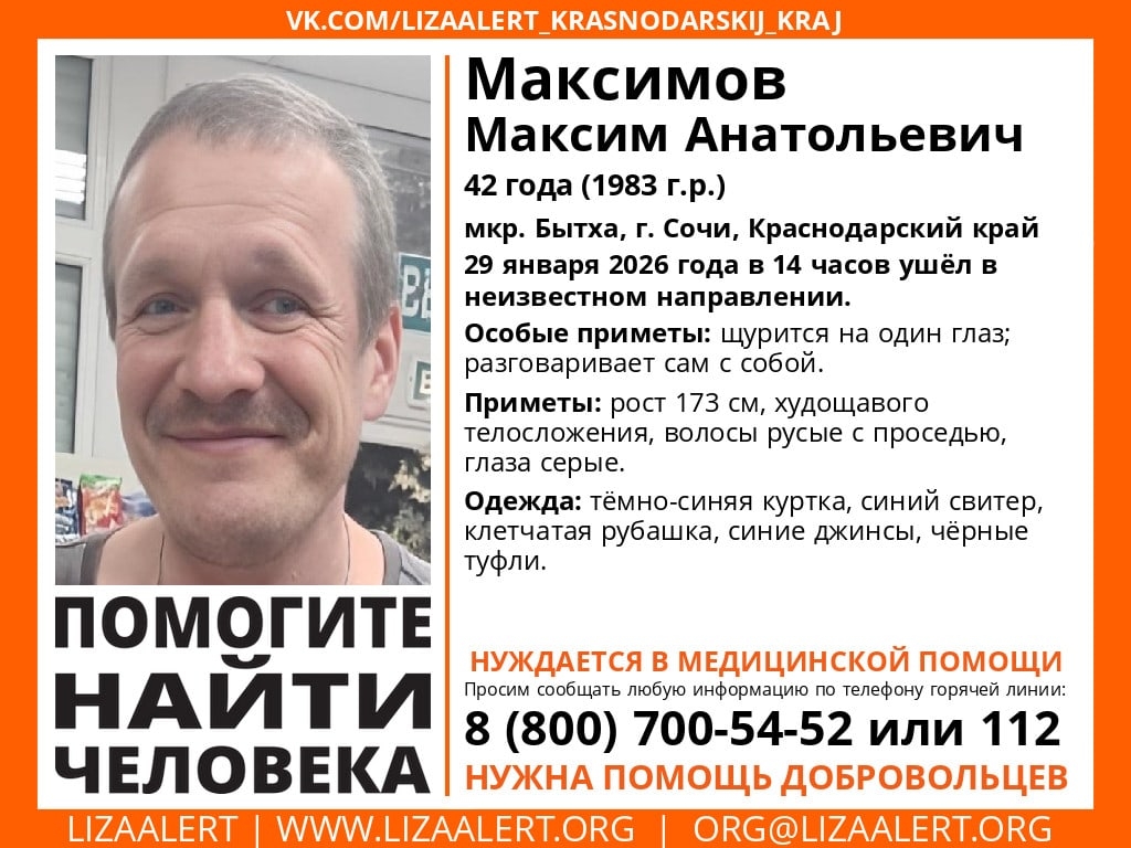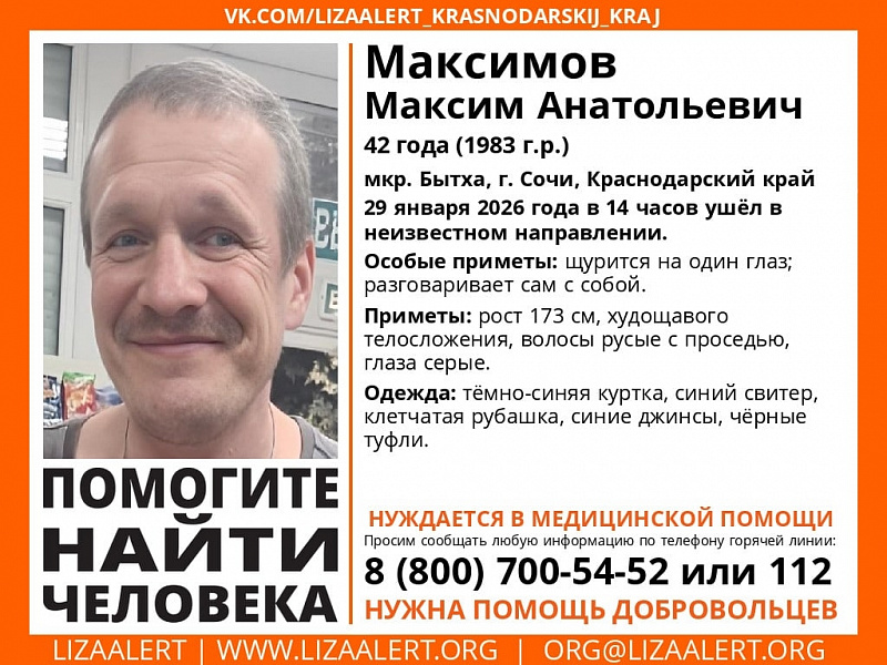 Максимов Максим Анатольевич 1983 г.р. пропал в микрорайоне Быта в Сочи. 29 января в 14 часов мужчина ушел в неизвестном направлении. Известно, что пропавший нуждается с медицинской помощи.