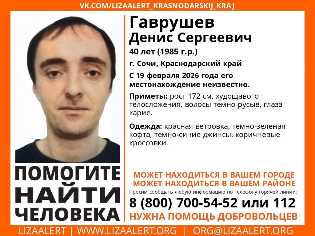 Гаврушев Денис Сергеевич 1985 г.р. пропал в Сочи 19 февраля, и с тех пор его местонахождение неизвестно.