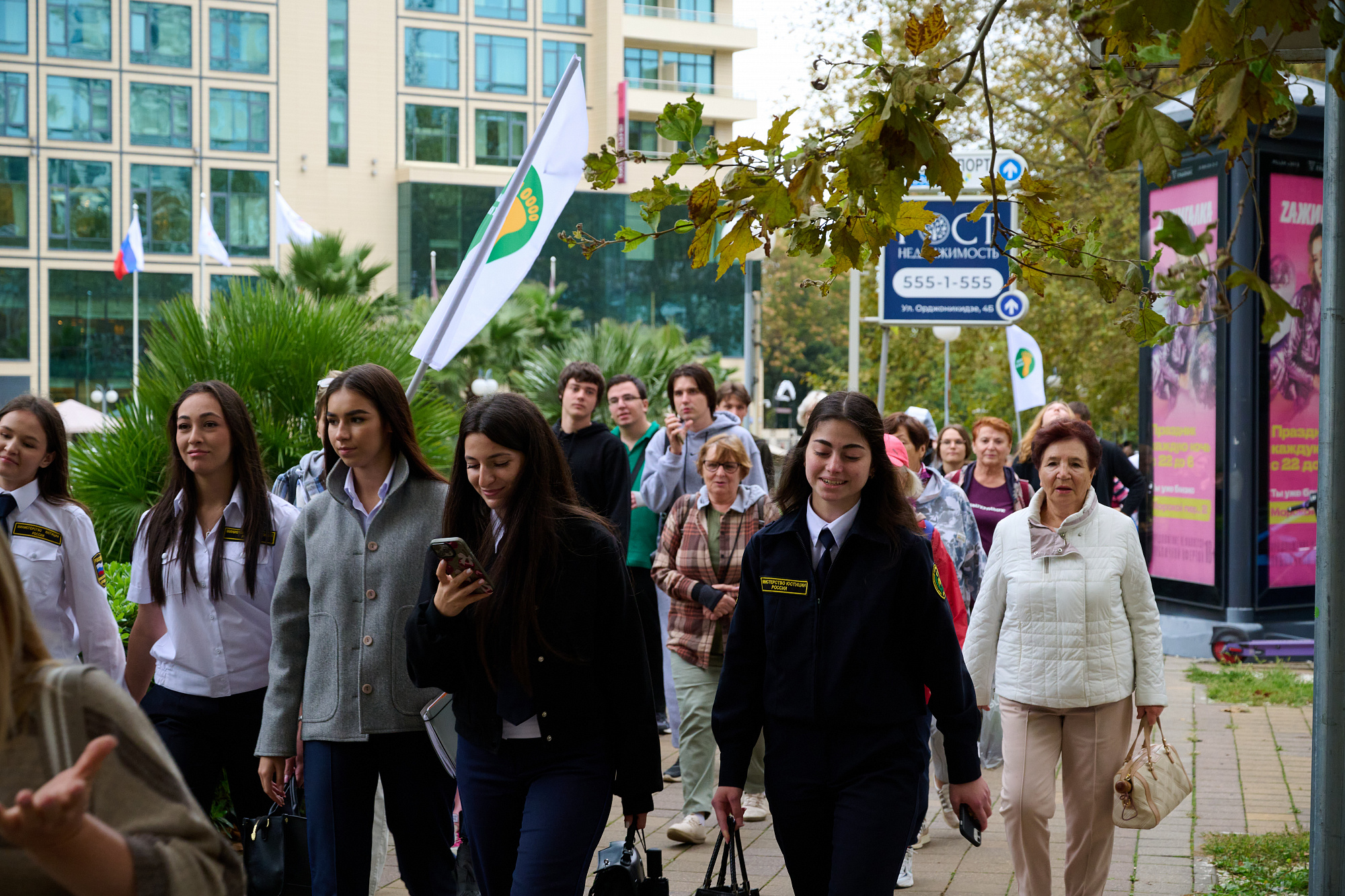 На маршрут, который проходил через Зимний театр, Верхнюю и Нижнюю Приморские набережные, улицу Несебрскую до Гранд-Марины, вышли представители городской администрации, работники трудовых коллективов и общественных организаций, студенты и учащиеся вузов, волонтеры-медики и волонтеры «Серебряного возраста».