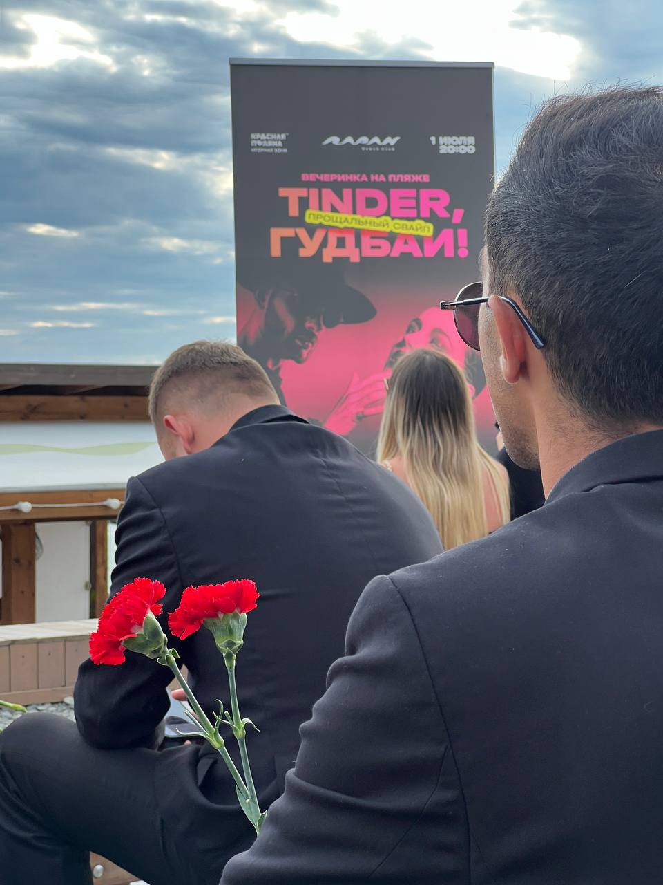 На прощальной церемонии, ставшей анонсом вечеринки, несколько десятков молодых людей в черной одежде вышли на набережную пляжа «Рапан» и зачитали истории - поделились личным опытом использования приложения для знакомств. Затем участники церемонии символически возложили по две красные гвоздики импровизированному надгробию, напоминающему экран смартфона. Крайне необычное прощание с Tinder привлекло внимание миллионов россиян: новость моментально попала в крупнейшие федеральные паблики.