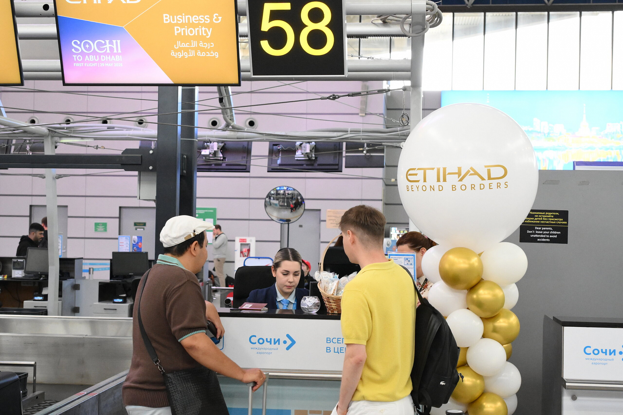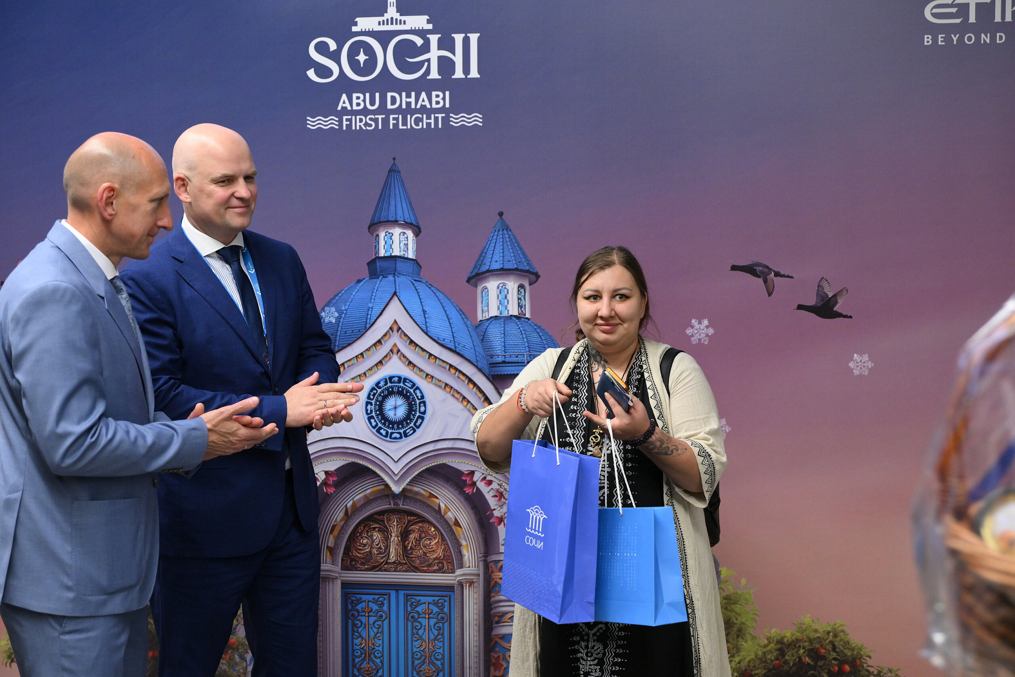 В зоне прилета международных авиалиний была организована фотозона, а стойки регистрации украшены воздушными шарами. Пассажиры первого рейса, которые прилетели из Абу-Даби, получили в подарок фирменные сувениры от аэропорта. Среди прибывших граждан был выбран случайным образом «Счастливый пассажир», им стала Елизавета Сабурова, которая получила ценные подарки от международного аэропорта Сочи и мэрии курорта.