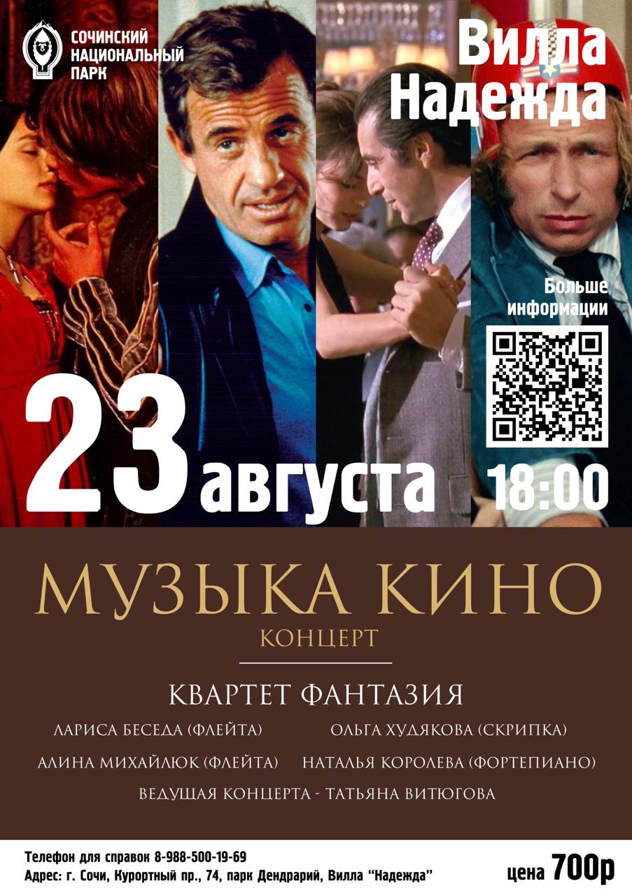 В субботу, 23 августа, в литературно-музыкальной гостиной виллы «Надежда» состоится концерт «Музыка кино» в исполнении лауреатов всероссийских и международных конкурсов квартета «Фантазия» в составе: Лариса Беседа (флейта), Алина Михайлюк (флейта), Ольга Худякова (скрипка), Наталья Королева (фортепиано). Ведущей концерта станет искусствовед и музыковед Татьяна Витюгова.