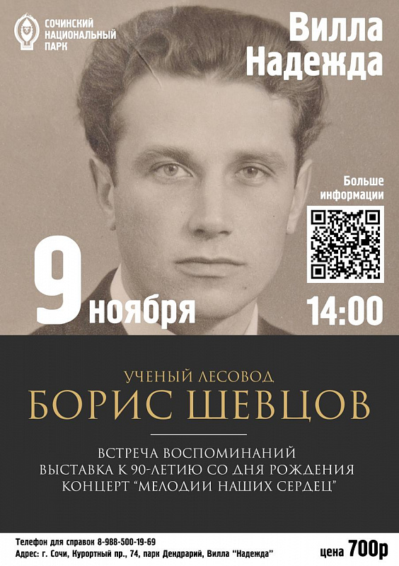 Интересными фактами из биографии выдающегося ученого Сочинского национального парка поделится с собравшимися гостями Дмитрий Кривошапка, заведующий выставочной экспозицией Вилла «Надежда». Его рассказ дополнят воспоминания членов семьи, а также выставка личных вещей и фотографий Бориса Шевцова.