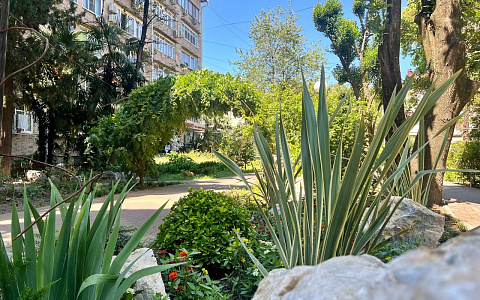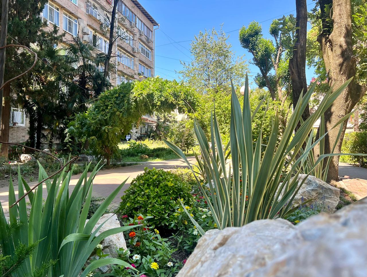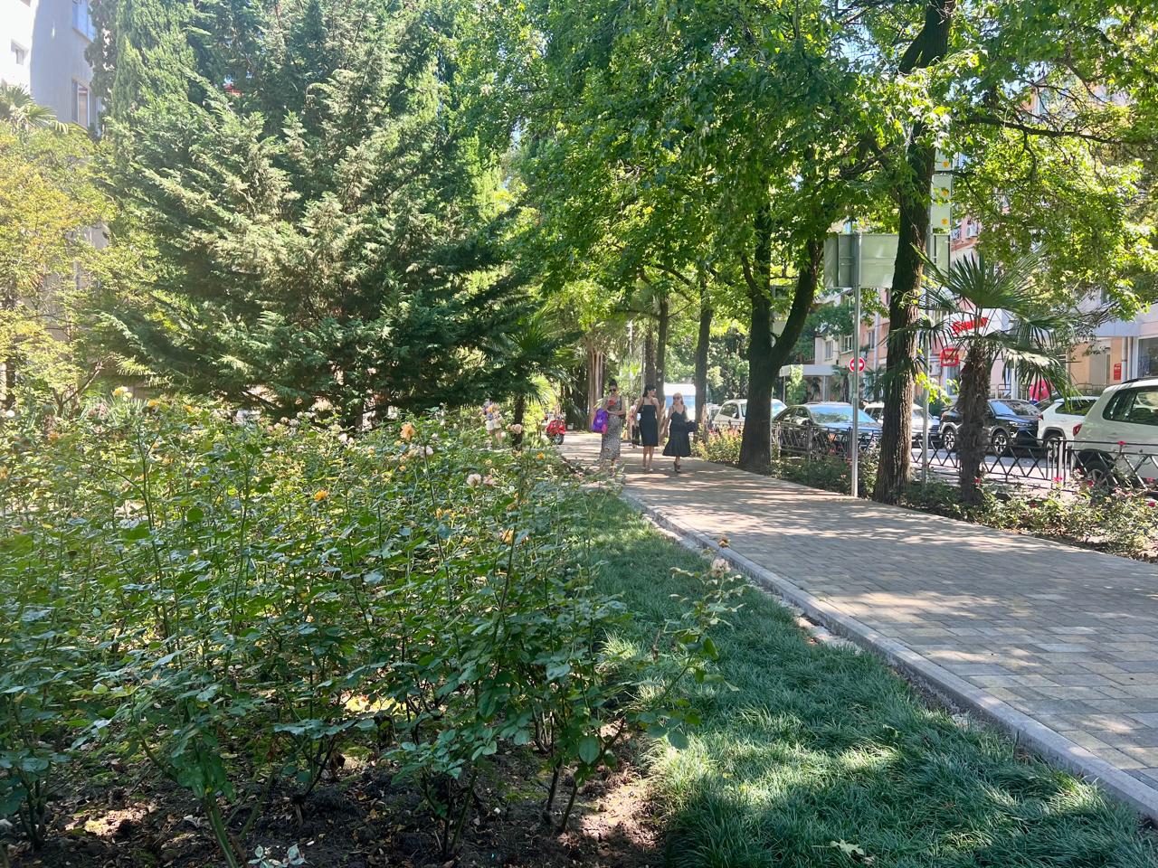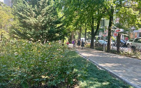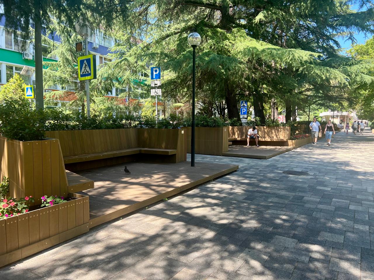Также работы по благоустройству выполнены в пешеходной зоне в Зеленом переулке. Выполнен ландшафтный дизайн территории, высажены многолетние растения и кустарники. Однолетние растения и цветы высаживаются на улицах Сочи несколько раз в течение года.