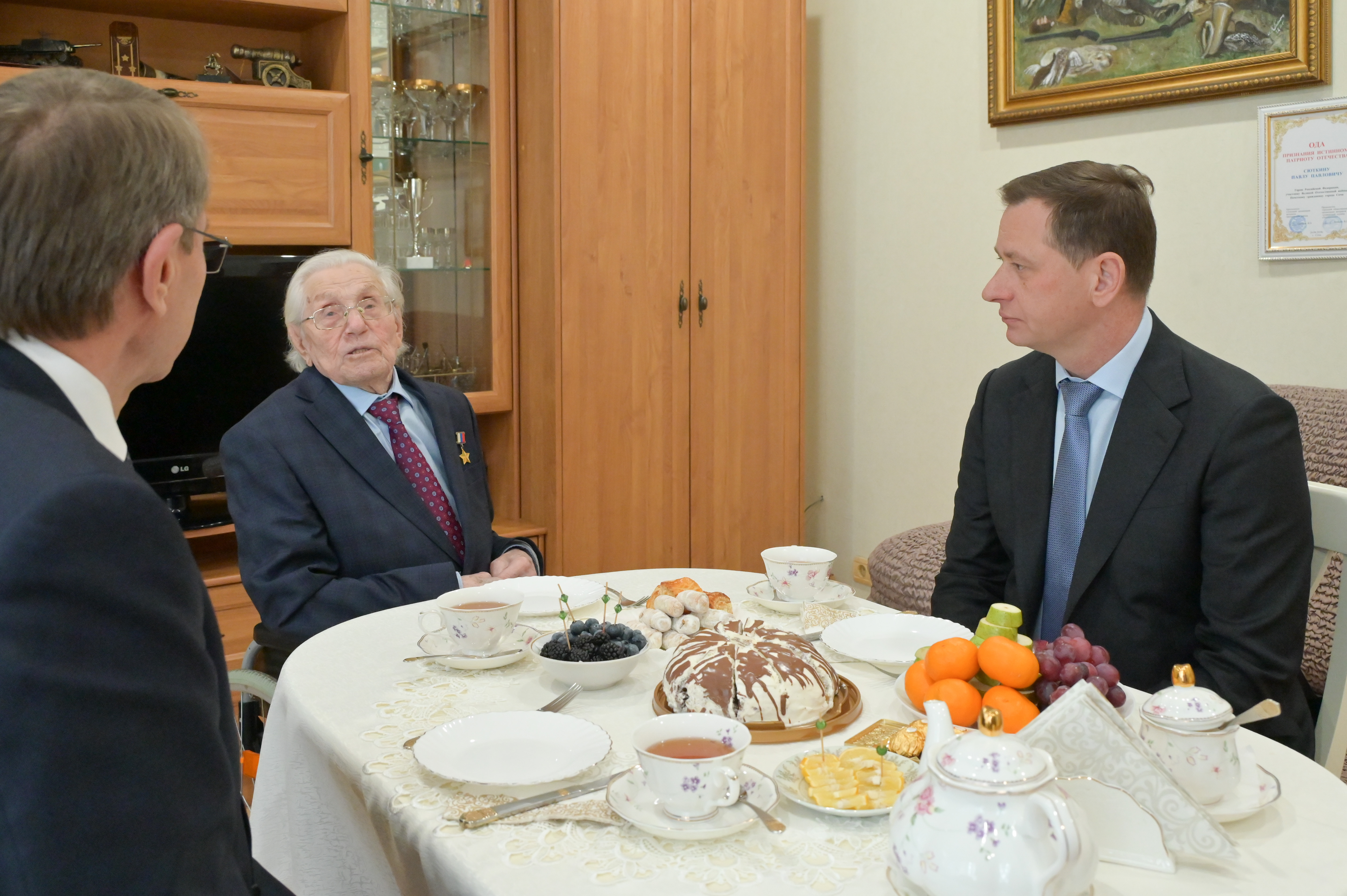 Сегодня глава города Андрей Прошунин и председатель Городского Собрания Сочи Виктор Филонов посетили участника Великой Отечественной войны, Героя Российской Федерации Павла Сюткина и поздравили его с праздником.