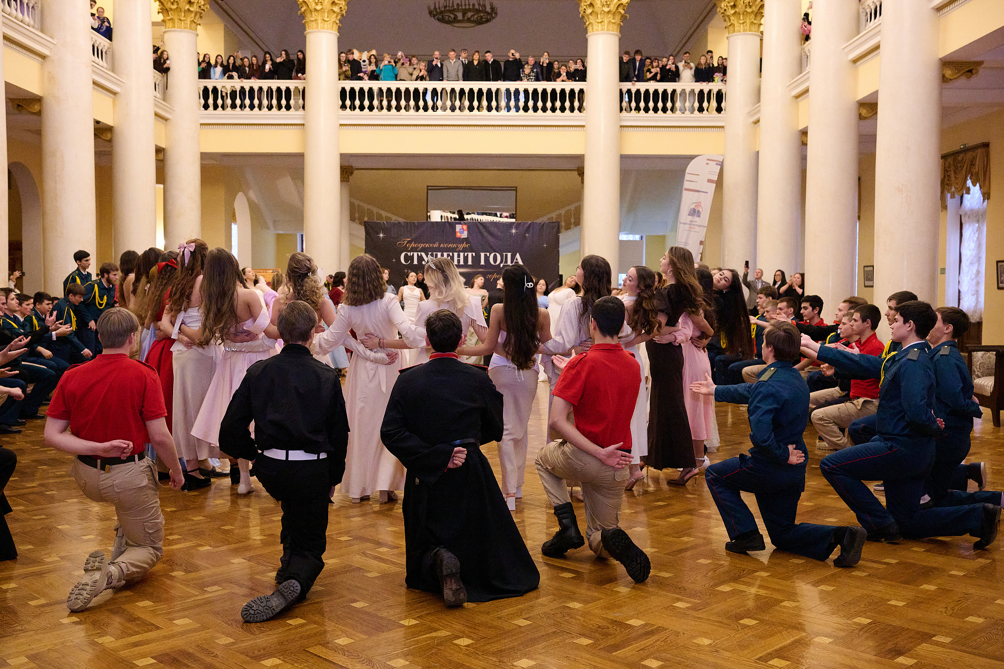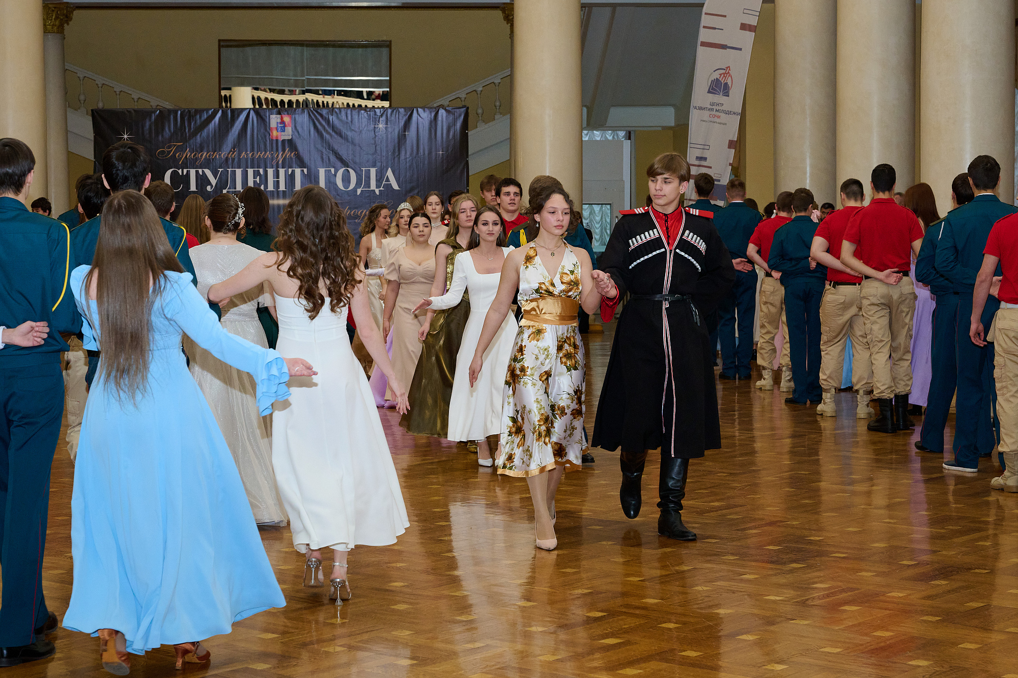 В преддверии праздника в Зимнем театре состоялся городской конкурс «Лучший студент года города Сочи». В рамках мероприятия в фойе театра прошел студенческий бал, в котором приняли участие более 100 человек. Среди них сочинские студенты, юнармейцы, воспитанники военно-патриотических, казачьих клубов и объединений.