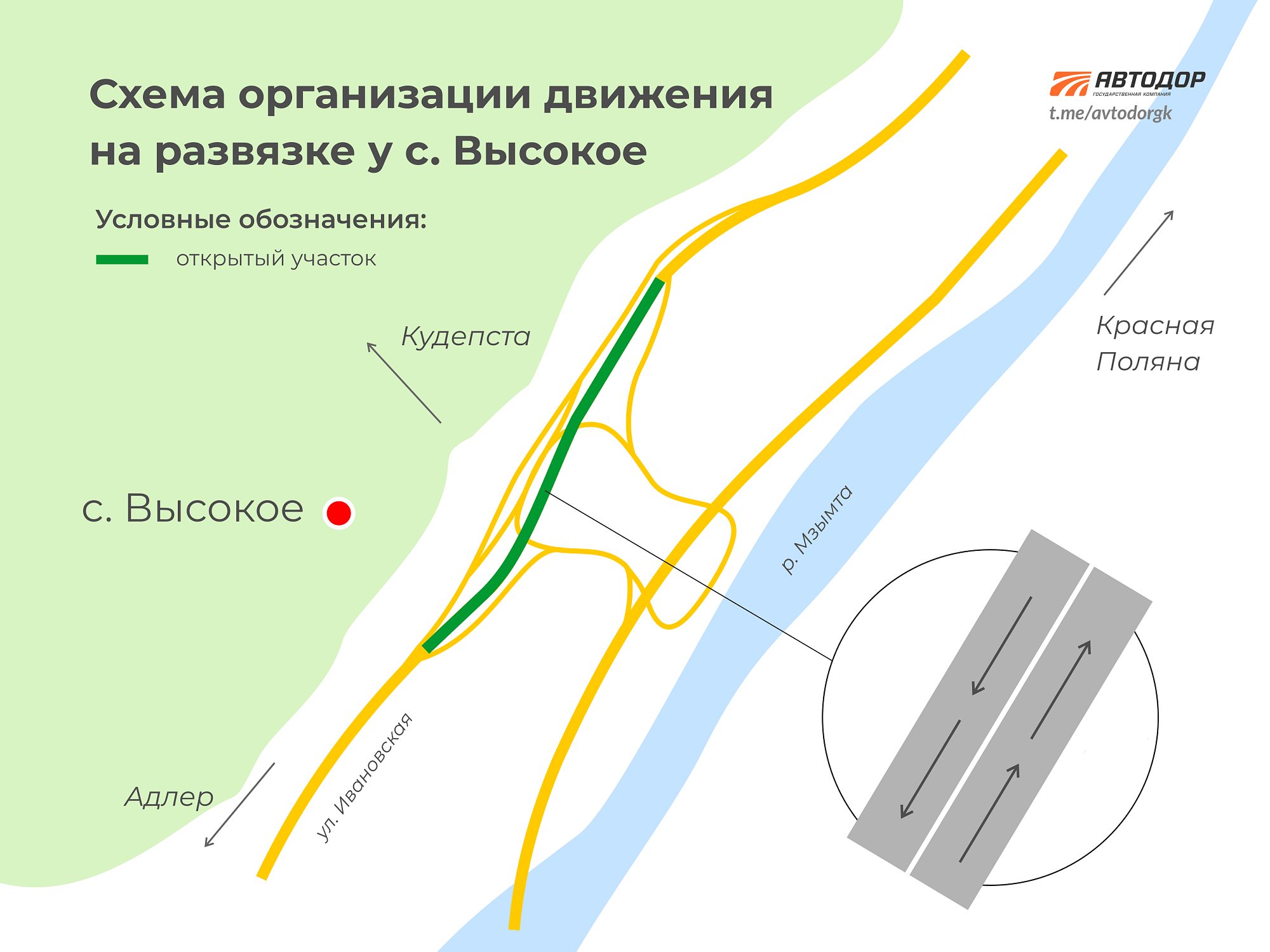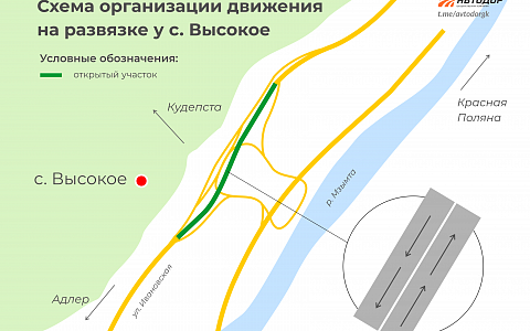 Государственная компания «Автодор» завершила реконструкцию части будущей большой развязки у восточного портала строящегося Обхода Адлера в селе Высокое. На расширенном до двух полос путепроводе накануне были закончены последние приготовления, и сегодня движение по нему открылось в обе стороны, в Красную Поляну и аэропорт Сочи. Скорость на данном участке ограничена Правилами дорожного движения до 60 км/ч.