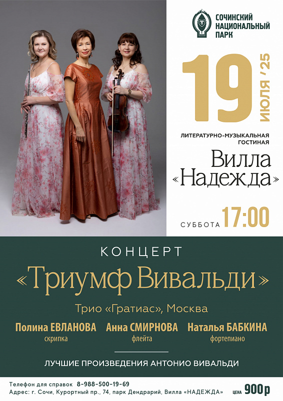 В субботу, 19 июля, в 17:00 в Литературно-музыкальной гостиной Виллы «Надежда» состоится концерт «Триумф Вивальди» в исполнении инструментального трио «Гратиас» (Москва): Полина Евланова (скрипка), Анна Смирнова (флейта), Наталья Бабкина (фортепиано).