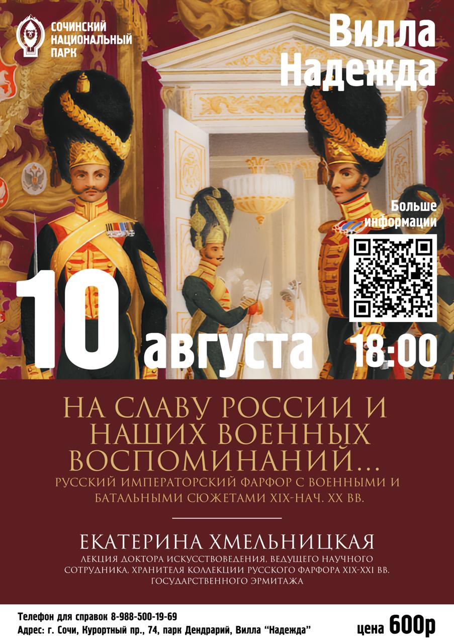 В воскресенье, 10 августа, в литературно-музыкальной гостиной Вилле «Надежда» состоится лекция «На славу России и наших военных воспоминаний…». Русский императорский фарфор с военными и батальными сюжетами XIX - нач. ХХ вв.», лектор - Екатерина Хмельницкая, доктор искусствоведения, ведущий научный сотрудник, хранитель коллекции русского фарфора XIX-XXI вв. Государственного Эрмитажа.