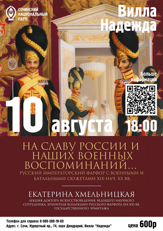 Лекция Екатерины Хмельницкой «На славу России и наших военных воспоминаний…». Русский императорский фарфор с военными и батальными сюжетами XIX - нач. ХХ вв.» на вилле «Надежда» в парке Дендрарий.