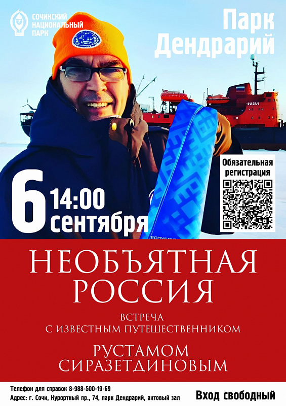 6 сентября 2025 года в 14.00 в актовом зале здания администрации Сочинского национального парка в Дендрарии состоится встреча с Рустамом Сиразетдиновым, известным путешественником, участником масштабной экспедиции «РоссиЯ - 2021», руководителем медиа-группы Регионального отделения Русского географического общества в Республике Башкортостан.