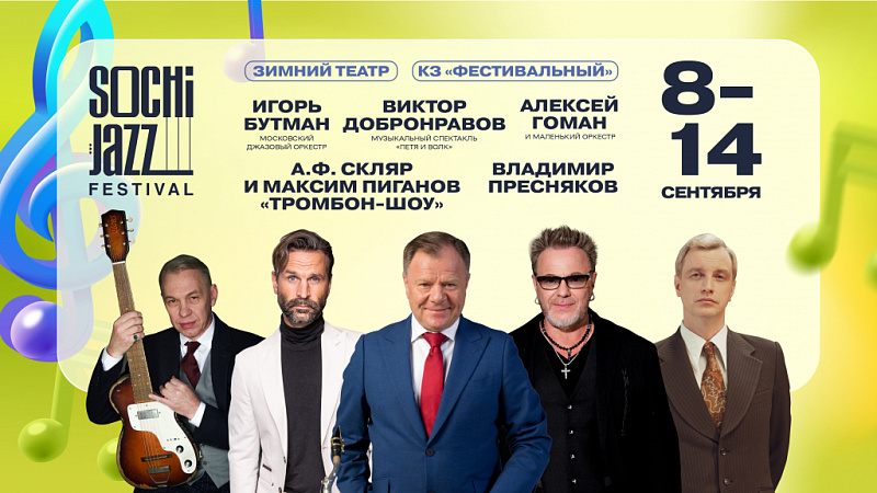 В этом году Sochi Jazz Festival пройдёт в главном городе-курорте страны с 8 по 14 сентября! Гостей фестиваля ждет насыщенная программа: мировые премьеры произведений, эксклюзивные концерты, творческие встречи с легендами джаза, мастер-классы для профессионалов и меломанов, а также джем-сейшны.