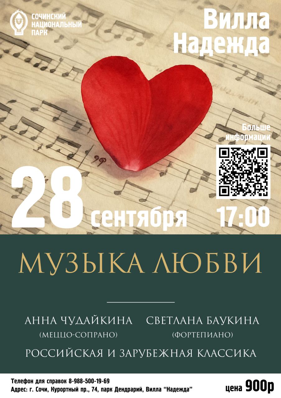 В воскресенье, 28 сентября, в 17:00 в литературно-музыкальной гостиной Виллы «Надежда» состоится концерт «Музыка любви», на котором выступят солисты Краснодарского музыкального театра им. Л. Гатова, лауреаты всероссийских и международных конкурсов Анна Чудайкина (меццо-сопрано) и Светлана Баукина (фортепиано).