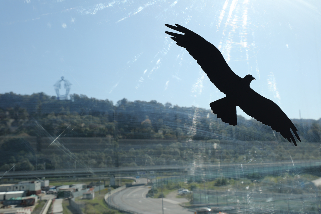 Специалисты Госкомпании «Автодор» разместили наклейки с силуэтами хищных птиц на шумозащитных экранах вдоль Ивановской эстакады у восточного портала обхода Адлера. Это проверенный способ отпугивать птиц поменьше, которые не замечают стекла и рискуют разбиться об них.