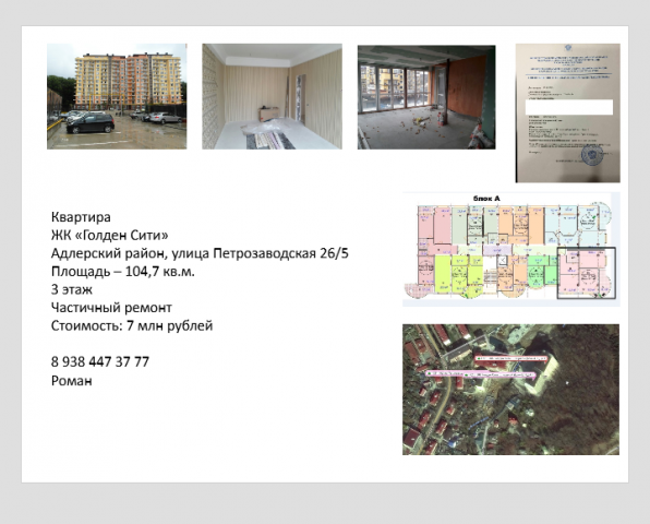 Продается 1-ком. квартира с хорошим ремонтом, площадью 50 кв.м. Отопление индивидуальное (газовый котел), остальные коммуникации центральные. Статус "нежилое помещение". Развитая инфраструктура. В шаговой доступности море, рынок, магазины, аптека, автобусная остановка. (Агентства и посредников просьба не беспокоить.)